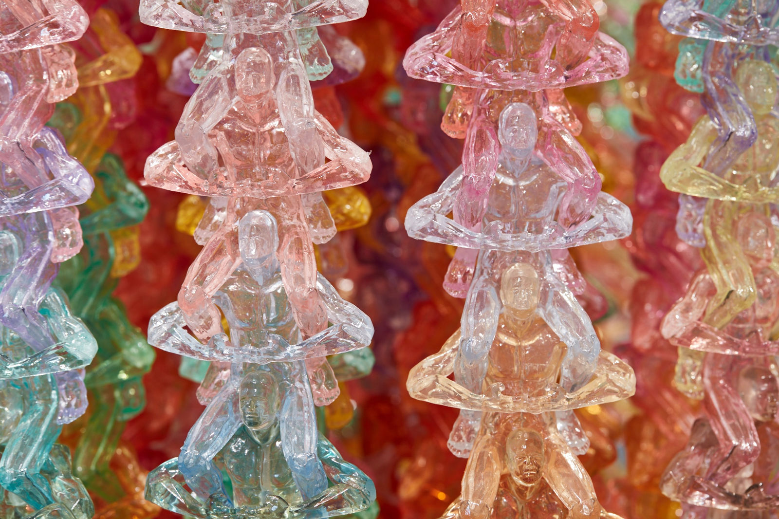 Through repetition, uniformity, and shifts in scale, Suh questions cultural and aesthetic differences between his native Korea and his adopted homes in the United States and Europe. The wallpaper Who Am We? (Multi) (2000) is made up of miniaturized yearbook portraits of the artist’s high school classmates, a nostalgic gesture that points both to the social connections of childhood and an immigrant’s estrangement from peers. While screens often decorate and divide Korean interiors, the many small figures that comprise Screen (2005) are used to examine opacity and transparency, division and connection, privacy and togetherness. The chandelier Cause and Effect (2007), composed of many figures appearing to rise from the shoulders of the single figure at bottom, playfully suggests that no matter where we travel, we carry the weight of our pasts on our shoulders.